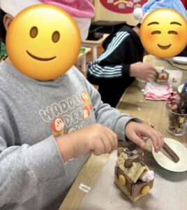 「ここはお庭だよ」「これは煙突!」と、それぞれがイメージを膨らませながら、世界にひとつだけのお菓子の家を完成させていました。